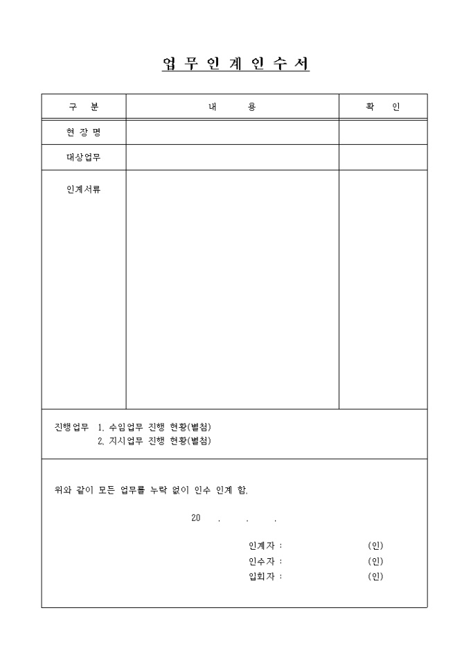 9,000원/월업무인계인수서입니다. 업무를 다른 사람에게 넘길때 사용하는 업무 인계, 인수서 양식입니다.