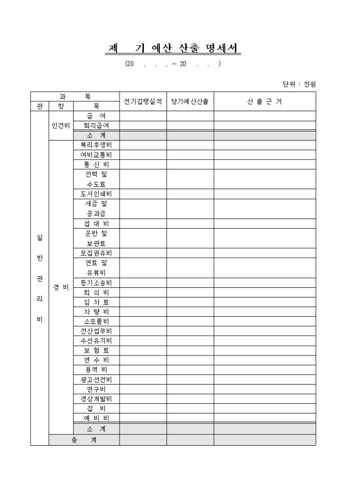 예산산출명세서입니다. 관리비에 대한 예산 산출에 대해서 각 항목을 작성하고 그 항복의 예산 산출근거 및 전기, 당기를 기입하는 명세서 양식입니다.