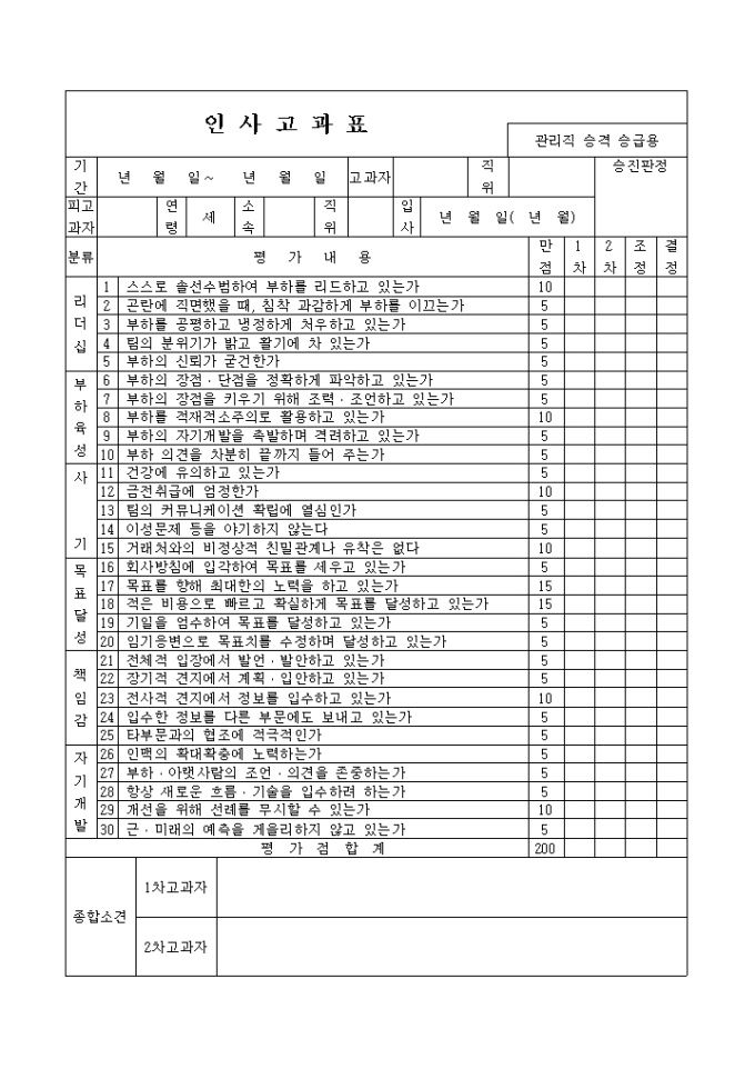 인사고과표(관리자승격용)입니다. 직원을 평가하기 위해서 각 항목에 대하여 질문을 답하는 형식으로 하는 인사고과표 양식입니다.