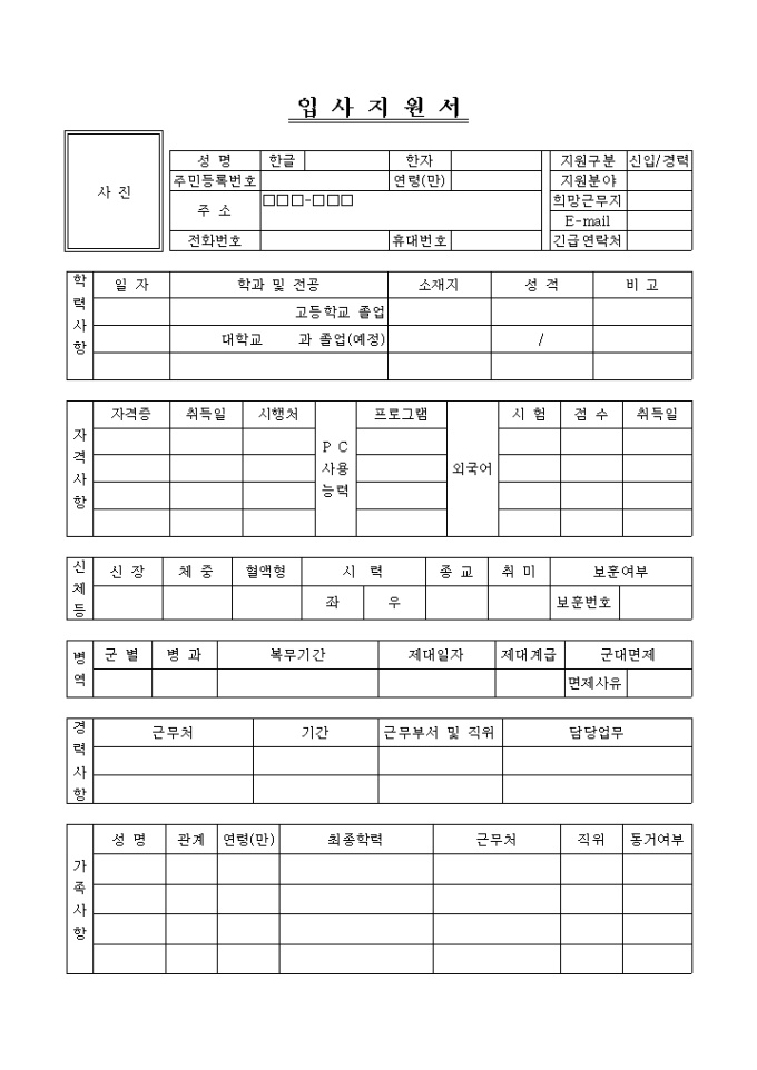 입사지원서입니다. 자사에서 사원을 모집할때 기본 이력서가 아닌 해당 입사 지원서를 사용하고자 할때 쓰는 입사지원서 양식입니다.