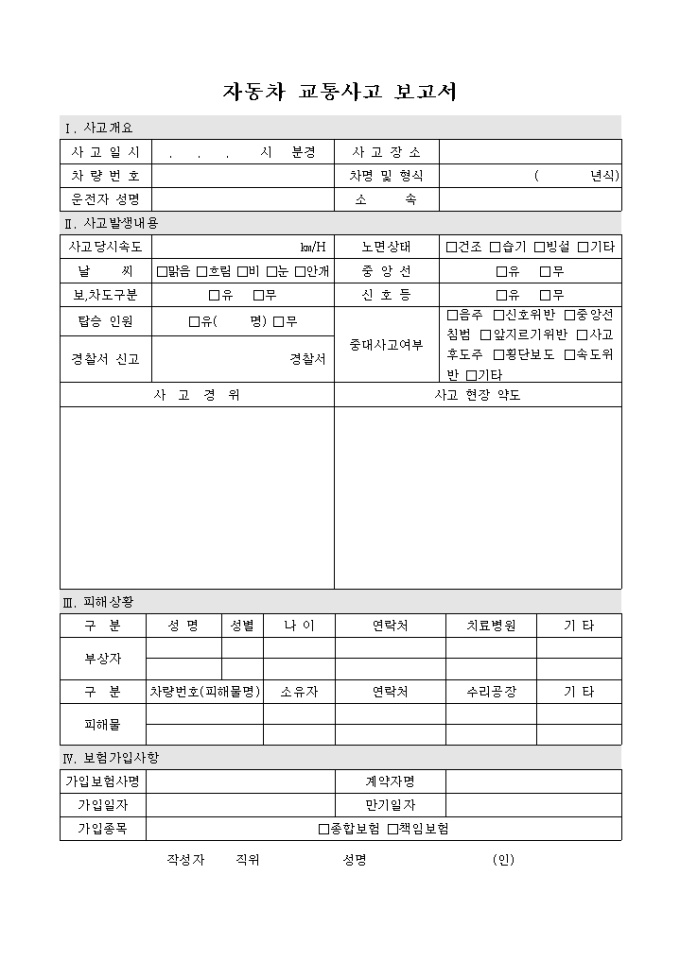 사고개요, 사고 발생내역을 기록하여 자동차 교통사고에 대한 보고를 작성하는 양식입니다.