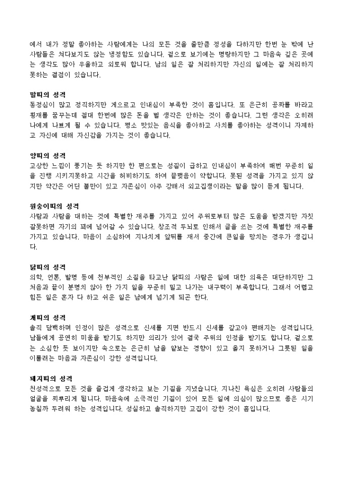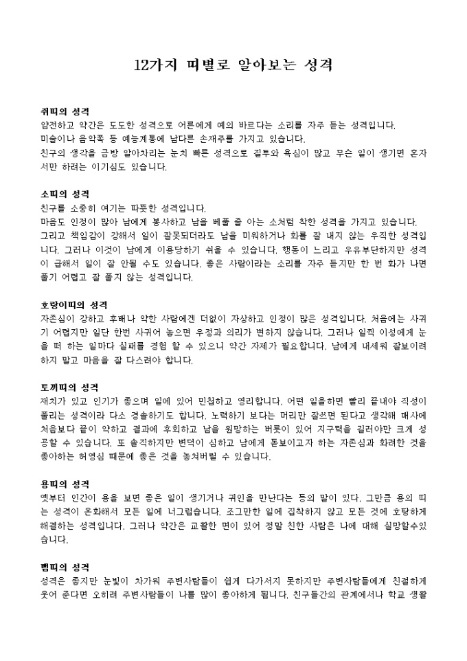 쥐, 소, 호랑이, 토끼 이하 십이지 동물들의 띠에 따른 성격을 나타낸는 12가지 띠별로 알아보는 성격에 관한 서식 입니다.