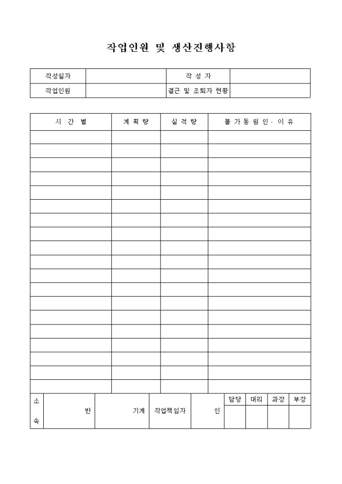 작업인원, 시간별 생산진행사항을 기록하는 작업인원 및 생산진행사항표입니다.