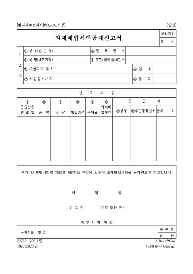 9,000원/월[별지제30호서식] 의제매입세액공제신고서 양식입니다. 부가가치세법시행령 제62조 제3항의 규정에 의하여 의제매입세액을 공제받고자 신고하실때 사용하는 양식입니다.