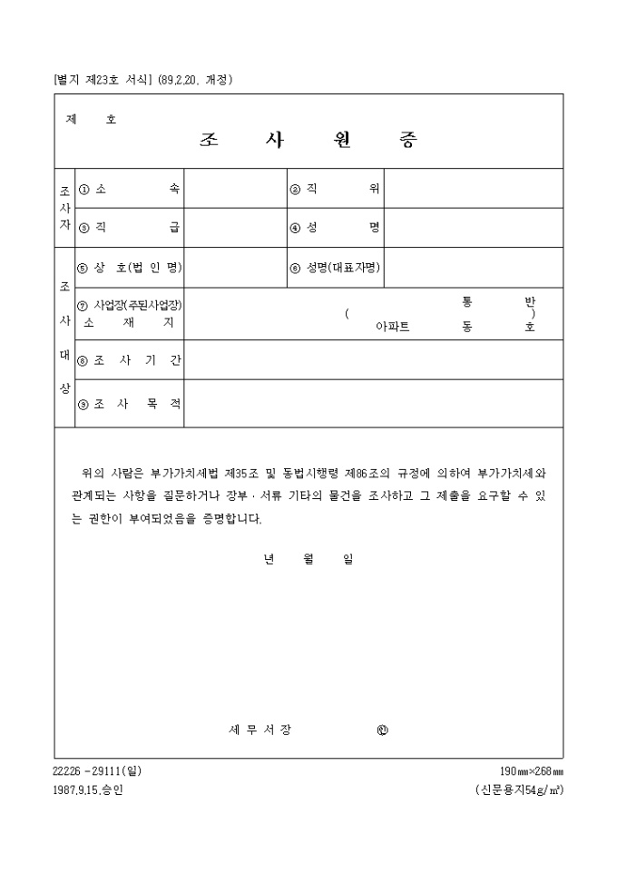 부가가치세법 제35조 및 동법시행령 제86조의 규정에 의하여 부가가치세와 관계되는 사항을 질문하거나 장부·서류 기타의 물건을 조사하고 그 제출을 요구할 수 있는 권한이 부여되었음을 증명하실때 사용하는 양식입니다.