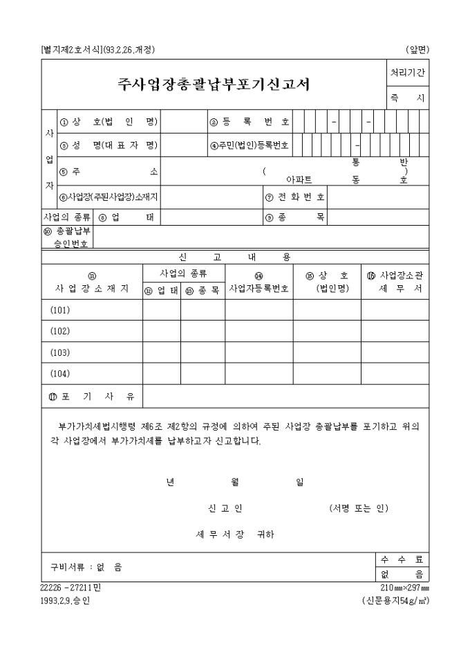부가가치세법시행령 제6조 제2항의 규정에 의하여 주된 사업장 총괄납부를 포기하고 위의 각 사업장에서 부가가치세를 납부하고자 신고하실때 사용하는 양식입니다.