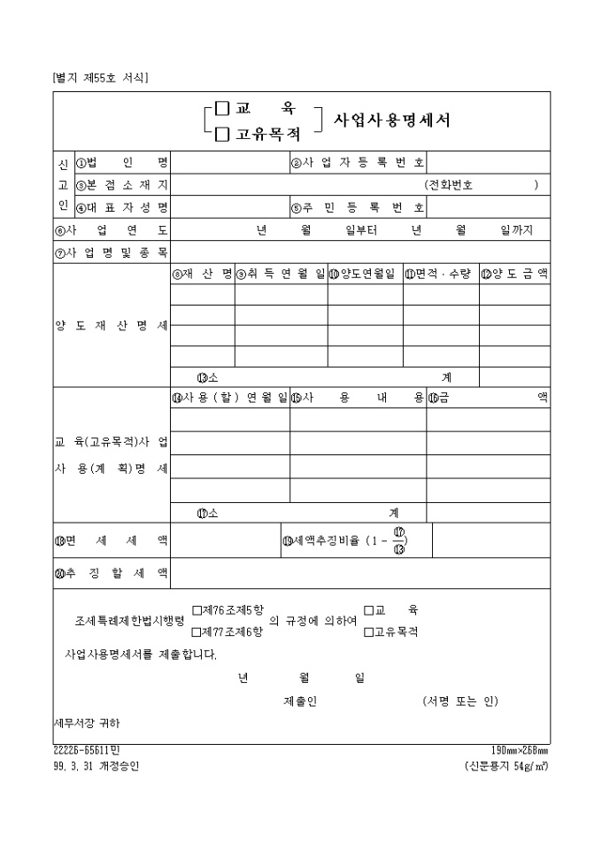 9,000원/월[별지 제55호 서식] 교육(고유목적)사업사용명세서 양식입니다. 조세특례제한법시행령 □제76조제5항, □제77조제6항의 규정에 의하여 □교 육 □고유목적 사업사용명세서를 제출하실때 사용하는 양식입니다.