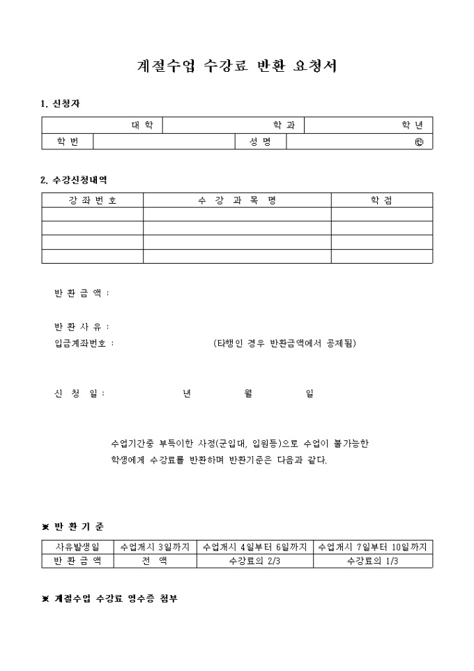9,000원/월계절수업 수강료 반환 요청서