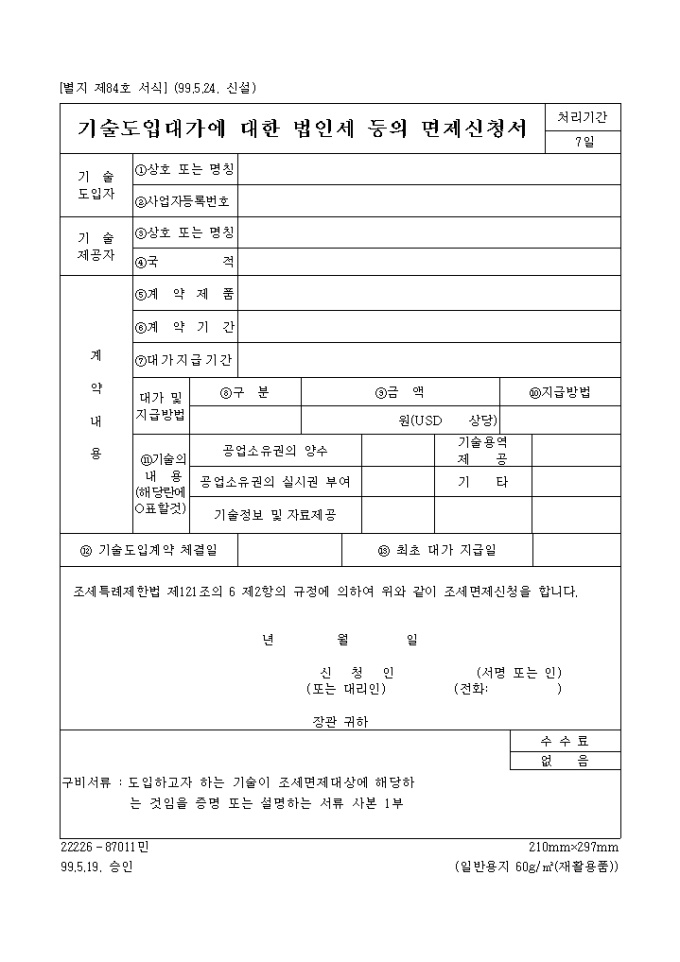 기술도입대가에대한법인세등의면제신청서 양식입니다.