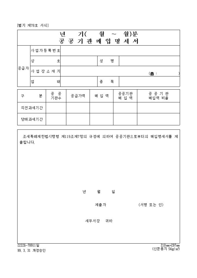 [별지 제78호 서식] 년기(월∼월)분공공기관매입명세서 양식입니다. 조세특례제한법시행령 제119조제7항의 규정에 의하여 공공기관으로 부터의 매입명세서를 제출하실때 사용하는 양식입니다.