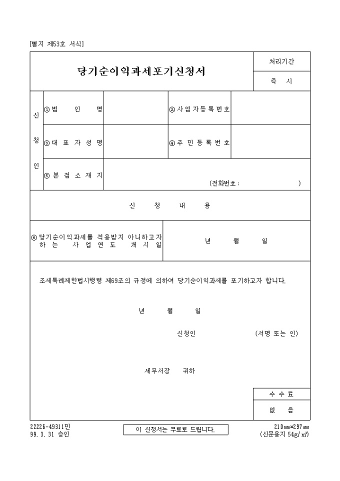 조세특례제한법시행령 제69조의 규정에 의하여 당기순이익과세를 포기하실때 사용하는 양식입니다.