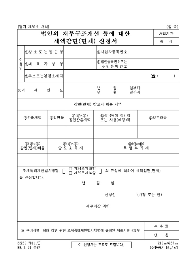 법인의재무구조개선등에대한세액감면(면제)신청서 양식입니다.