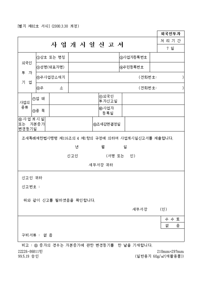 [별지 제82호 서식] 사업개시일신고서 양식입니다. 조세특례제한법시행령 제116조의 4 제1항의 규정에 의하여 사업개시일신고서를 제출하실때 사용하는 양식입니다.