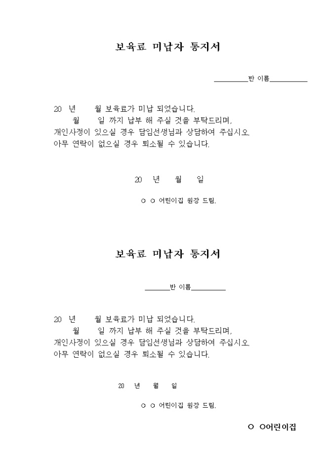 9,000원/월어린이집료 미납자 통지서