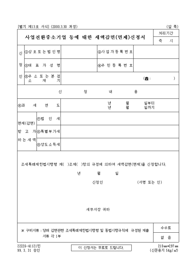사업전환중소기업등에대한세액감면(면제)신청서 양식입니다.