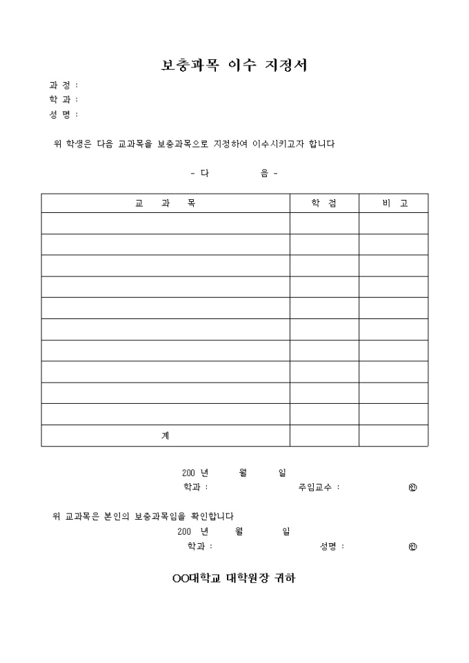 보충과목 이수 지정서