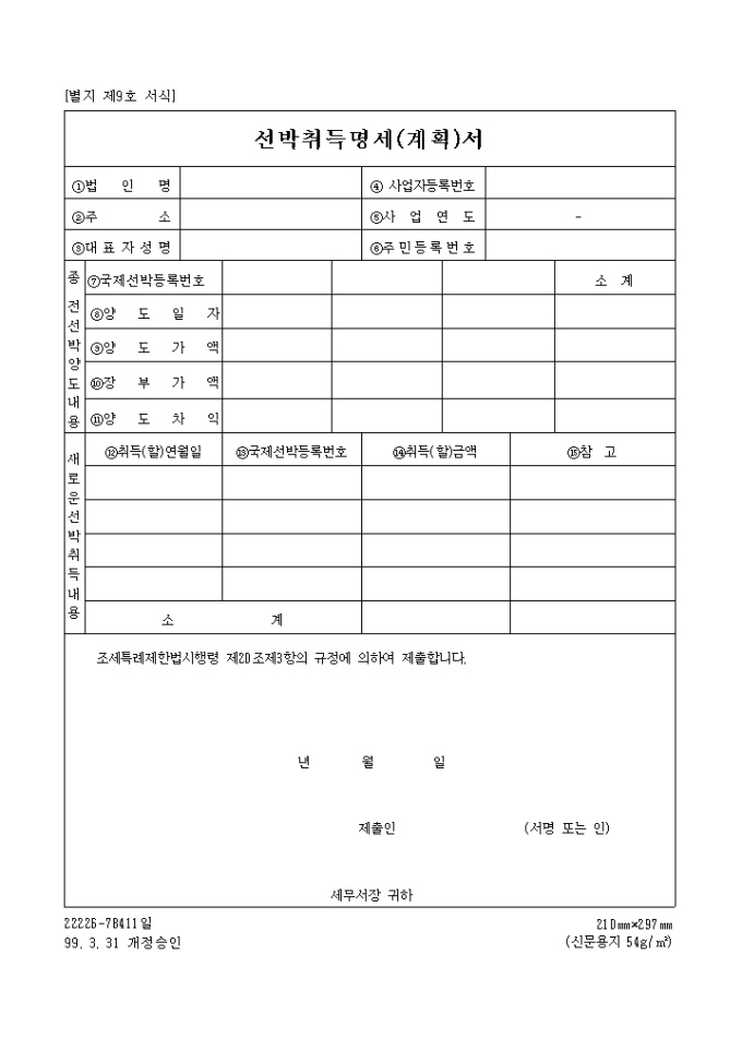 [별지 제9호 서식] 선박취득명세(계획)서 양식입니다. 조세특례제한법시행령 제20조제3항의 규정에 의하여 제출하실때 사용하는 양식입니다.