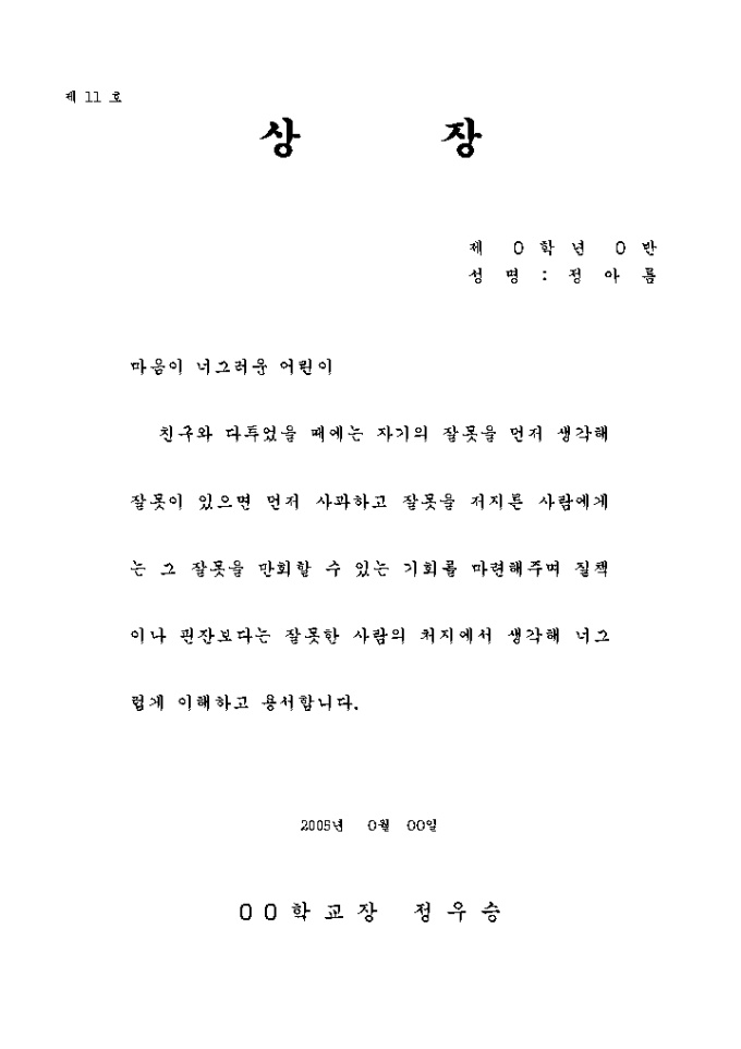 상장예문 (마음이 너그러운 어린이)