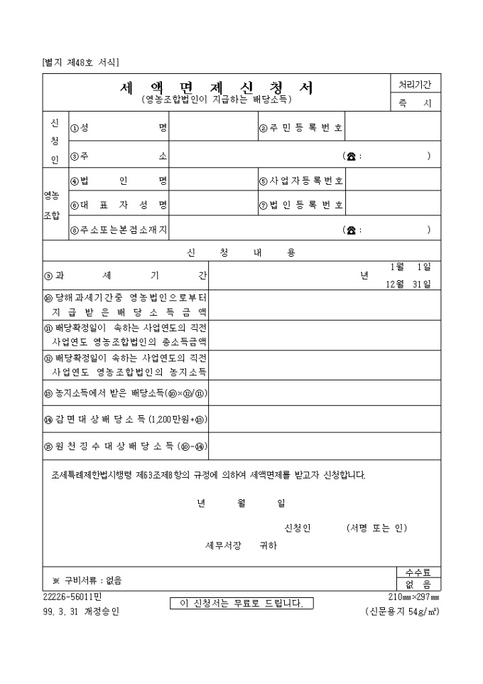 세액면제신청서(영농조합법인이지급하는배당소득) 양식입니다.