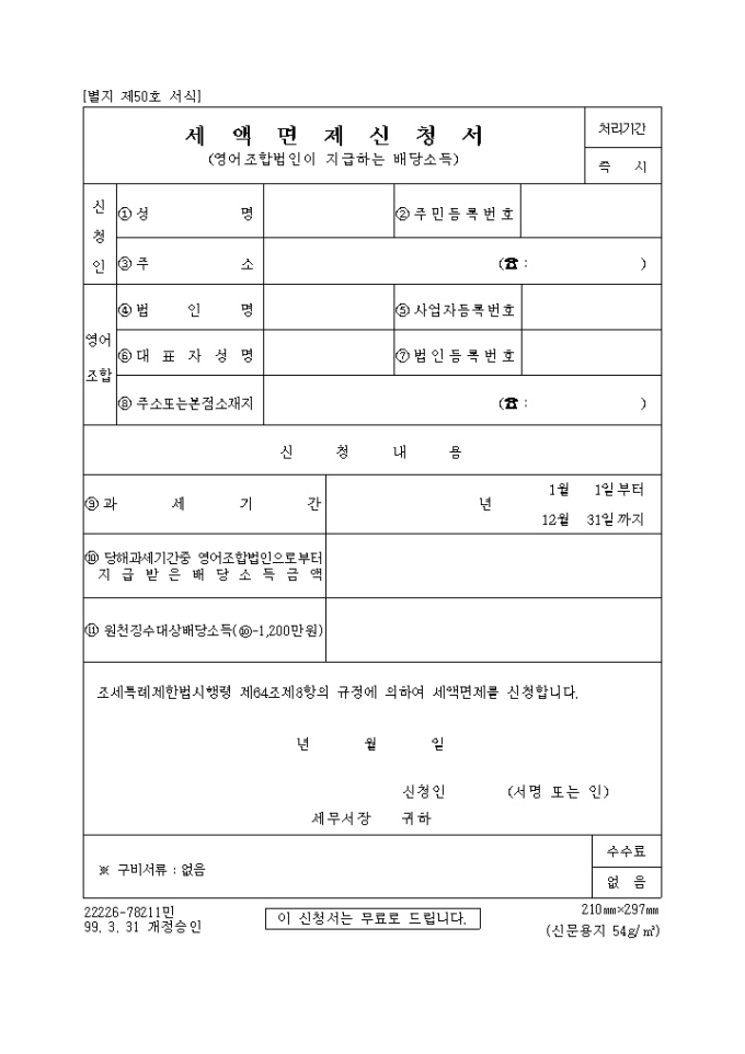 9,000원/월[별지 제50호 서식] 세액면제신청서(영어조합법인이지급하는배당소득) 양식입니다. 조세특례제한법시행령 제64조제8항의 규정에 의하여 세액면제를 신청하실때 사용하는 양식입니다.