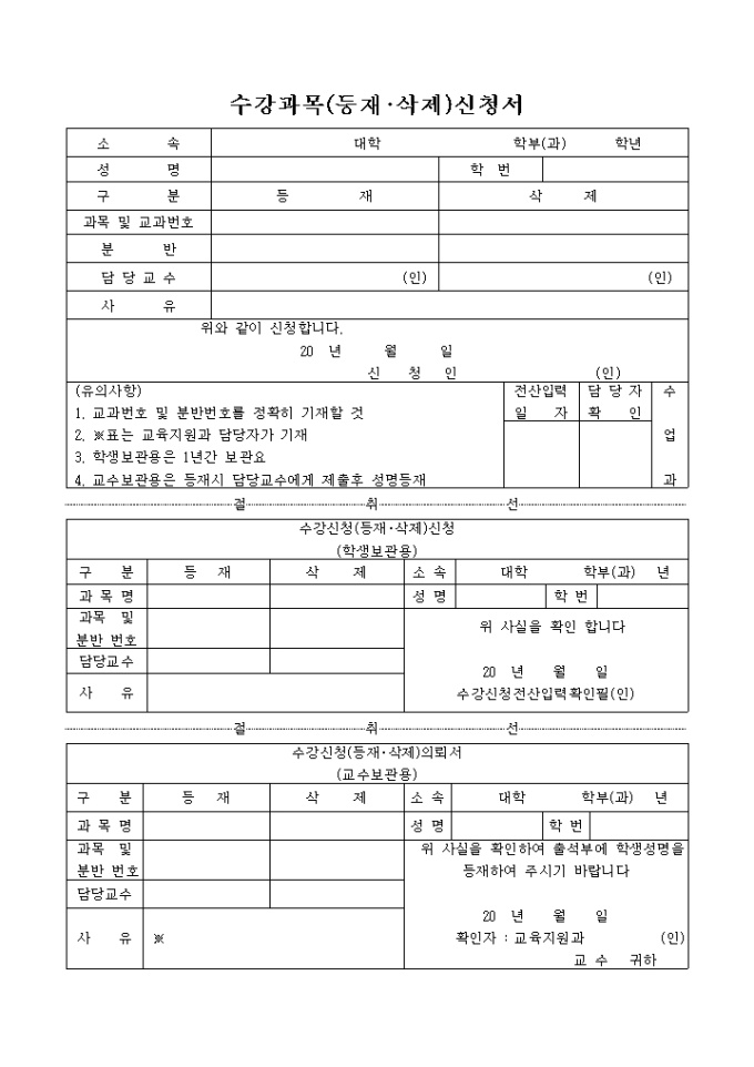 수강과목(등재, 삭제)신청서