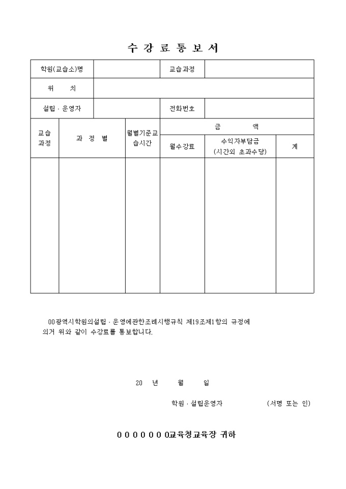 9,000원/월수강료 통보서 (학원수강)