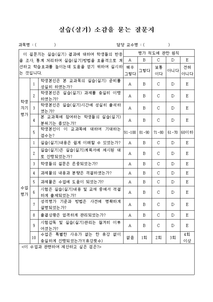 실습(실기)소감을 묻는 질문지