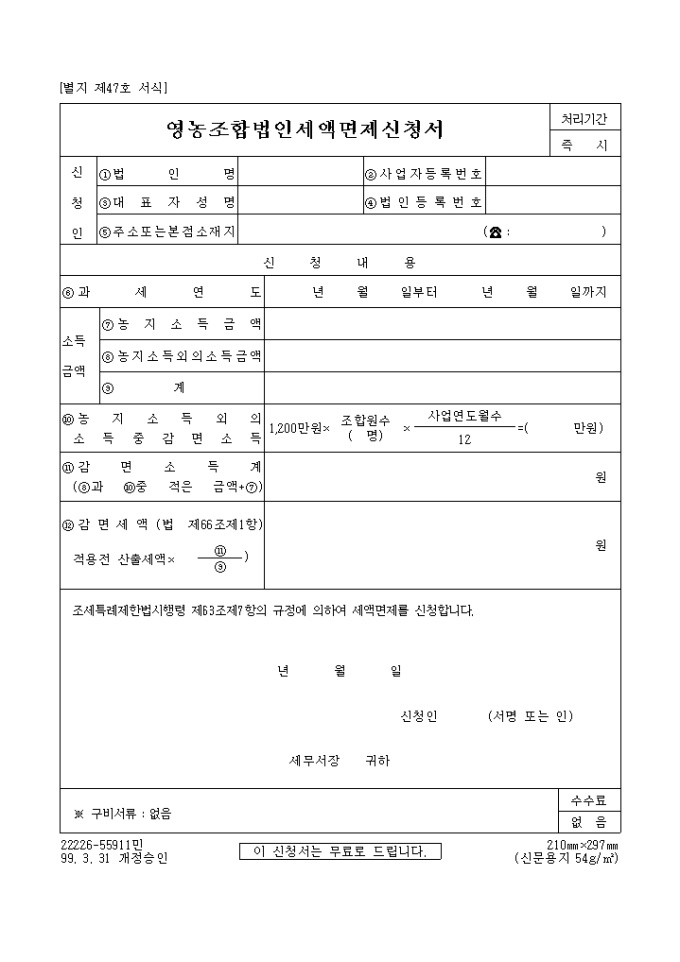 9,000원/월[별지 제47호 서식] 영농조합법인세액면제신청서 양식입니다. 조세특례제한법시행령 제63조제7항의 규정에 의하여 세액면제를 신청하실때 사용하는 양식입니다.