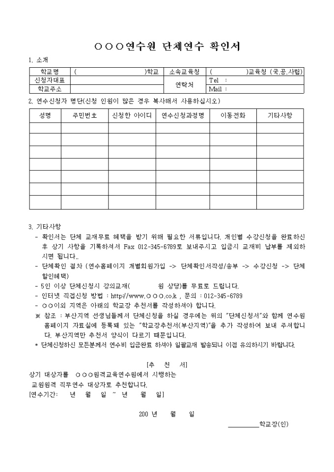 연수원 단체연수 확인서