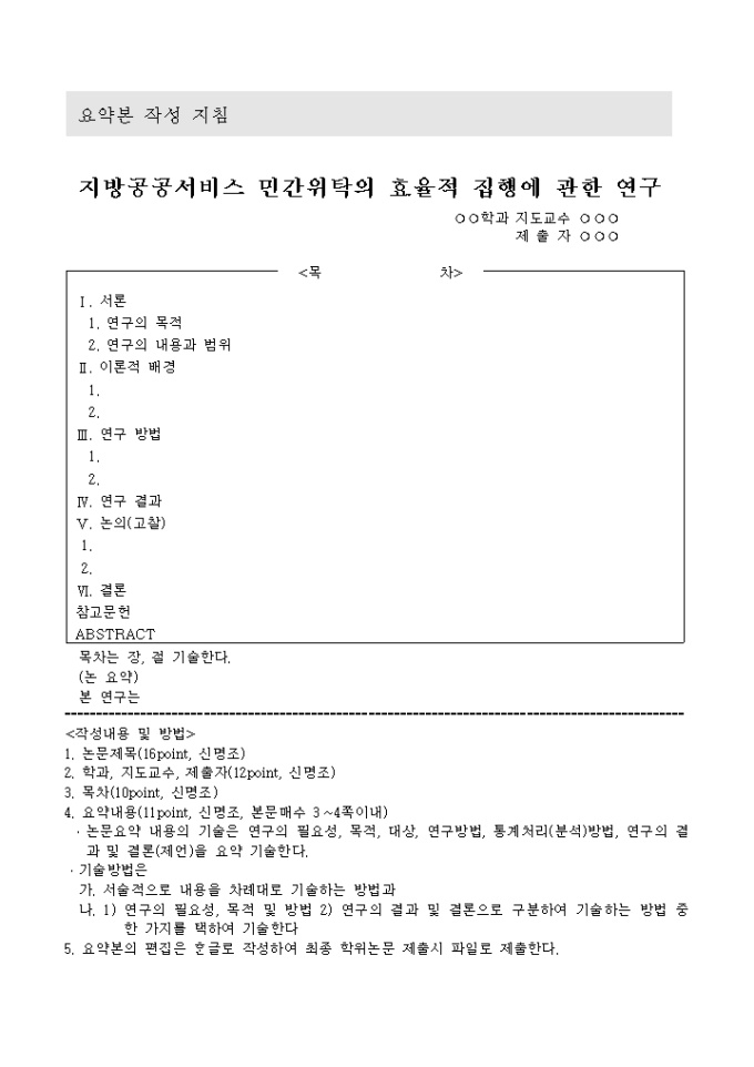 요약본 작성 지침 (지방공공서비스 민간위탁의 효율적 집행에 관한 연구)