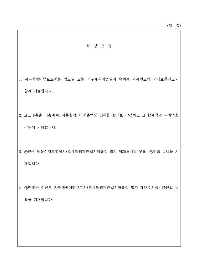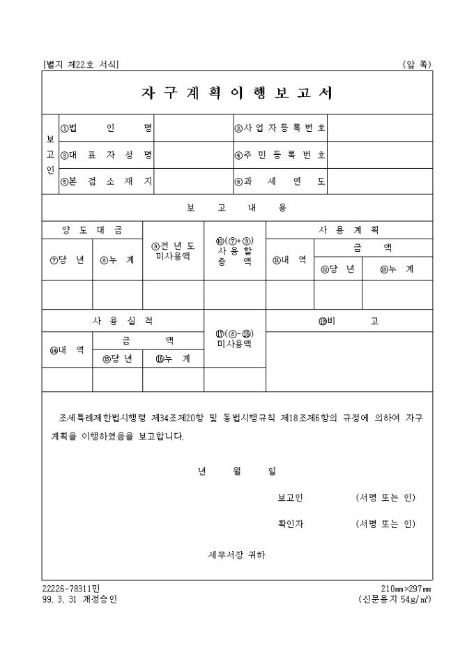 조세특례제한법시행령 제34조제20항 및 동법시행규칙 제18조제6항의 규정에 의하여 자구계획을 이행하였음을 보고하실때 사용하는 양식입니다.