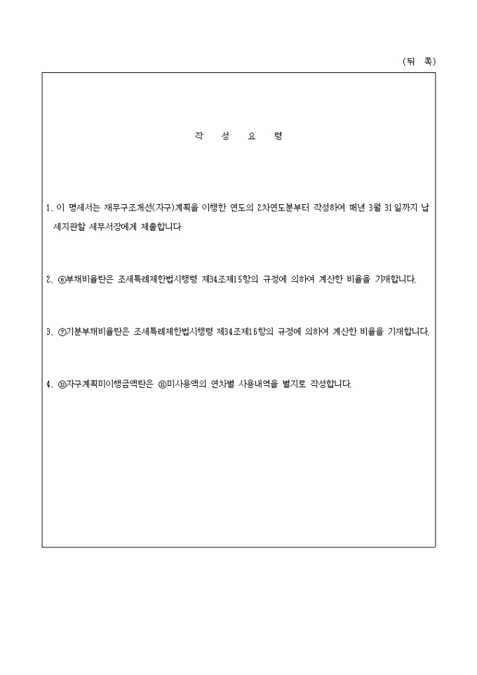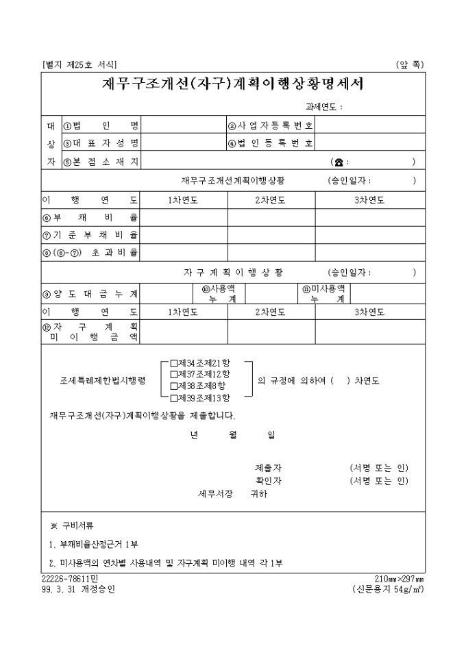 [별지 제25호 서식] 재무구조개선(자구)계획이행상황명세서 양식입니다. 조세특례제한법시행령 □제34조제21항 □제37조제12항 □제38조제8항 □제39조제13항 의 규정에 의하여 ( ) 차연도 재무구조개선(자구)계획이행상황을 제출하실때 사용하는 양식입니다.