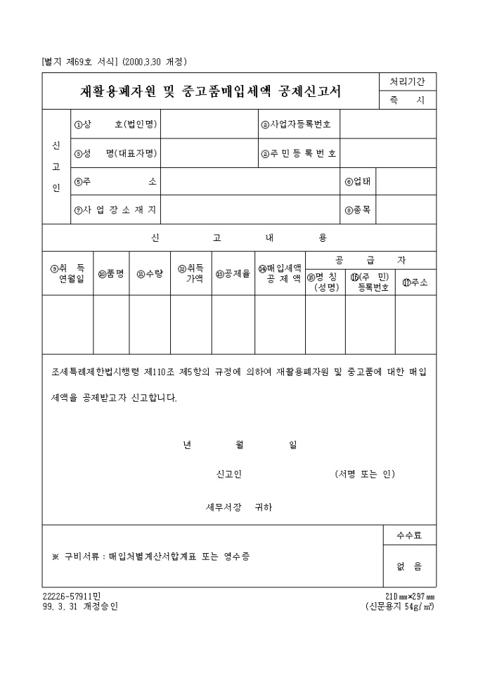 재활용폐자원 및 중고품매입세액공제신고서