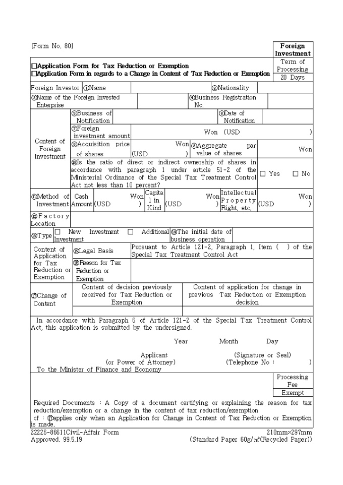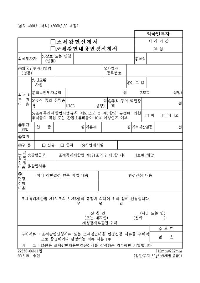 9,000원/월[별지 제80호 서식] 조세감면신청서(조세감면내용변경신청서) 양식입니다. 조세특례제한법 제121조의 2 제6항의 규정에 의하여 위와 같이 신청하실때 사용하는 양식입니다.