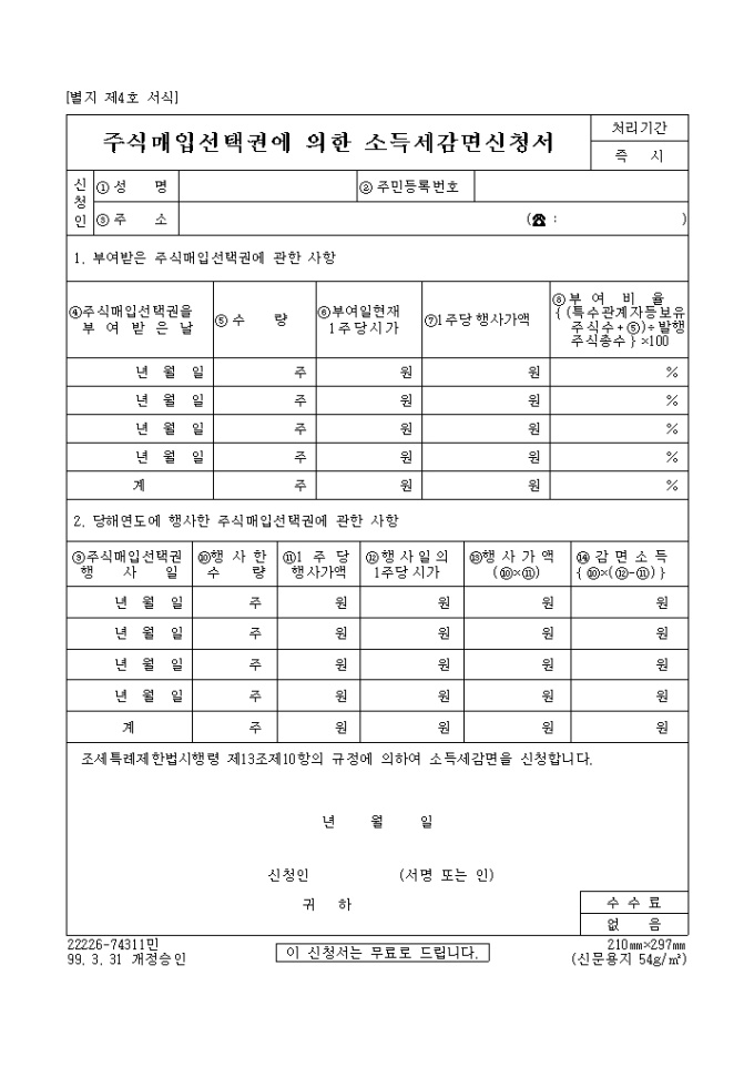 주식매입선택권에 의한소득세감면신청서