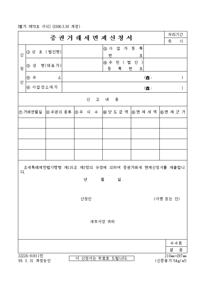 [별지 제70호 서식] 증권거래세면제신청서 양식입니다. 조세특례제한법시행령 제115조 제3항의 규정에 의하여 증권거래세 면제신청서를 제출하실때 사용하는 양식입니다.