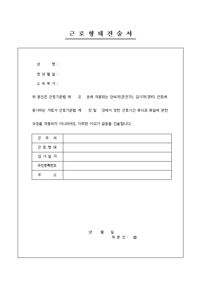 9,000원/월근로기준법에서 정한 근로시간 휴식과 휴일에 관한 규정을 적용하지 아니하여 도 아무런 이의가 없음을 진술하는 근로형태 진술서입니다. 성명, 생년월일, 소속, 근로형태등을 기술하도록 되어 있습니다.