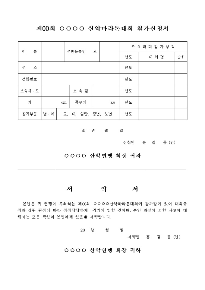 대회 참가 신청서 (산악마라톤 대회 참가용)