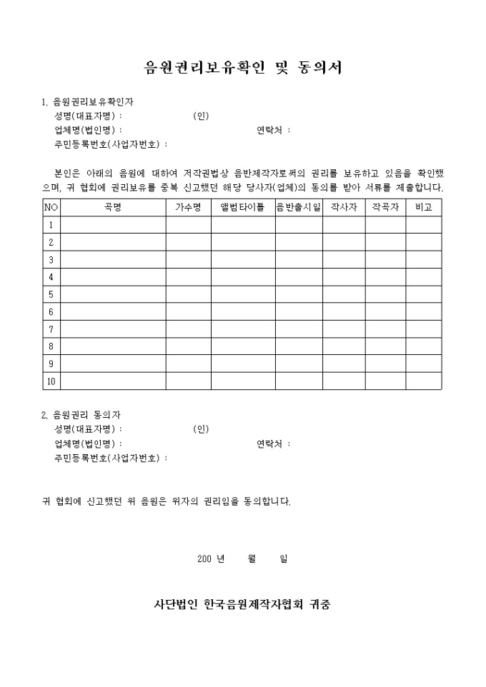 9,000원/월음원권리보유확인 및 동의서