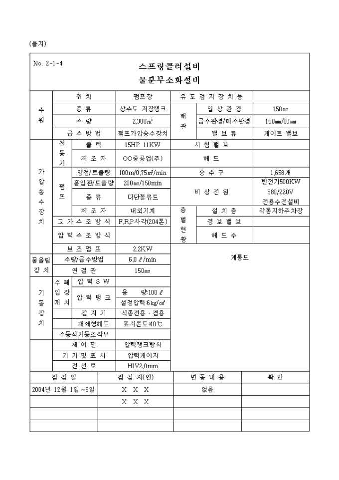 소방 점검일지 (스프링클러설비, 물분무소화설비)