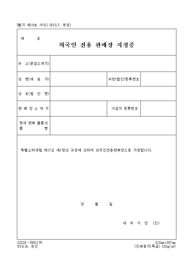 9,000원/월[별지 제19호 서식] 외국인전용판매장지정증 양식입니다. 특별소비세법 제17조 제1항의 규정에 의하여 외국인전용판매장으로 지정하실때 사용하는 양식입니다.