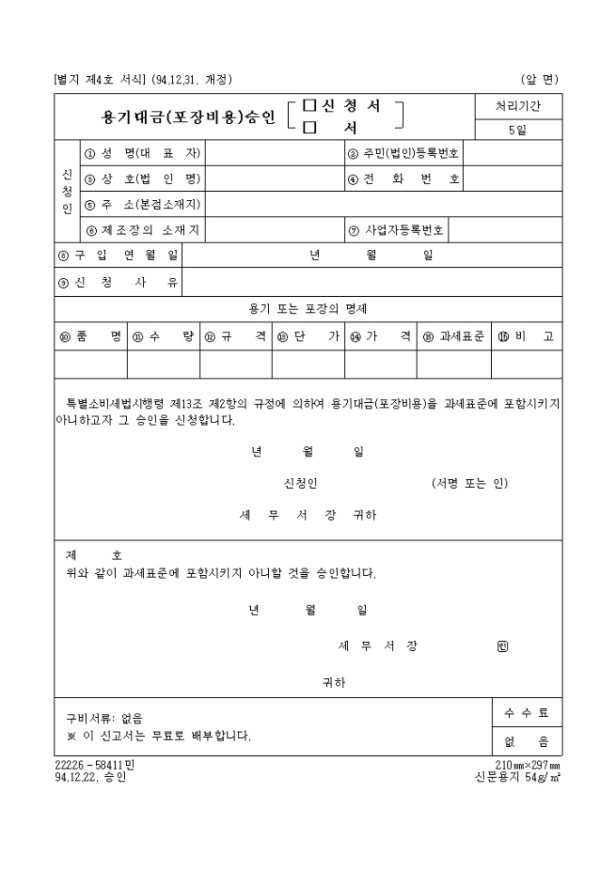 [별지 제4호 서식] 용기대금(포장비용)승인(신청)서 양식입니다. 특별소비세법시행령 제13조 제2항의 규정에 의하여 용기대금(포장비용)을 과세표준에 포함시키지 아니하고자 그 승인을 신청하실때 사용하는 양식입니다.