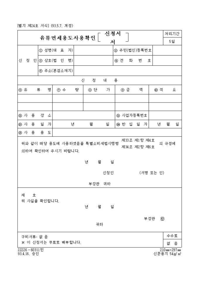 9,000원/월[별지 제24호 서식] 유류면세용도사용확인(신청)서 양식입니다. 해당 용도에 사용하였음을 특별소비세법시행령 제33조 제1항 제4호, 제34조 제2항 제6호 의 규정에 의하여 확인하실때 사용하는 양식입니다.