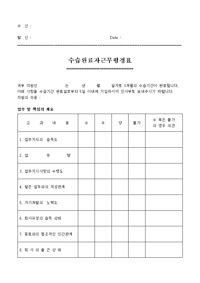 9,000원/월업무 및 책임의 개요, 수습기간의 연장등의 항목으로 구성되어 있는 수습완료자 근무평정표 양식 입니다.