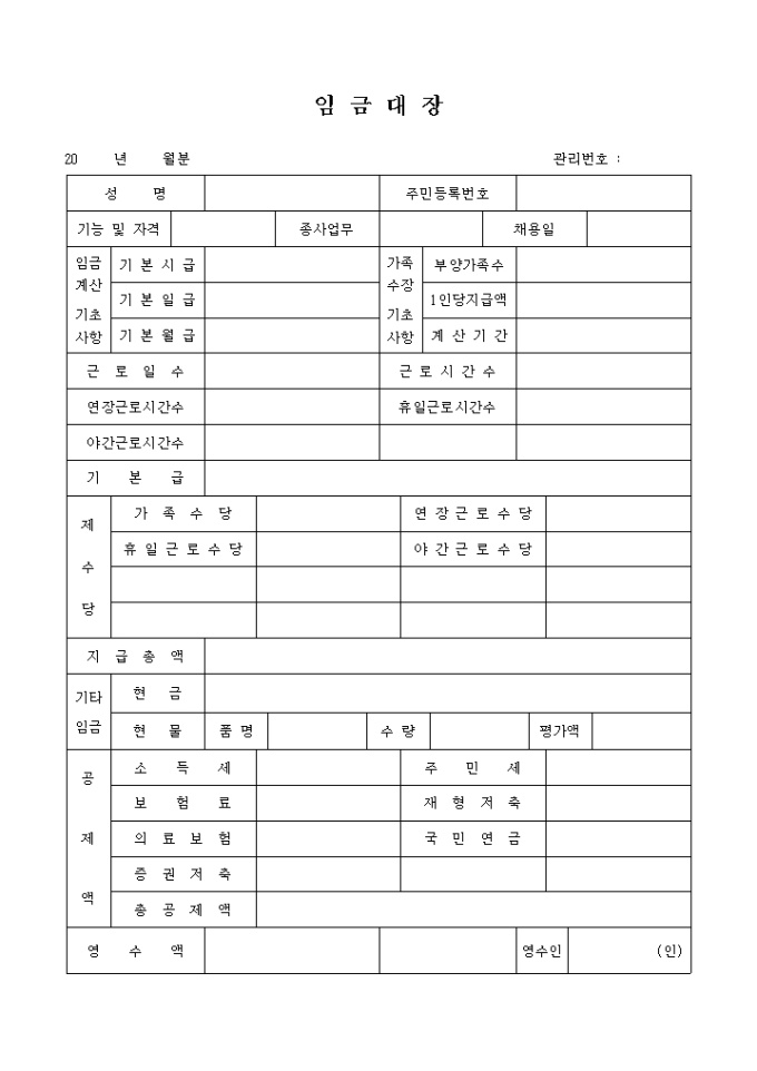 9,000원/월임금계산 기초사항, 가족수장 기초사항, 근로일, 근로시간, 제수당, 기타임금, 공제액 등을 포함하는 임금대장 양식입니다.