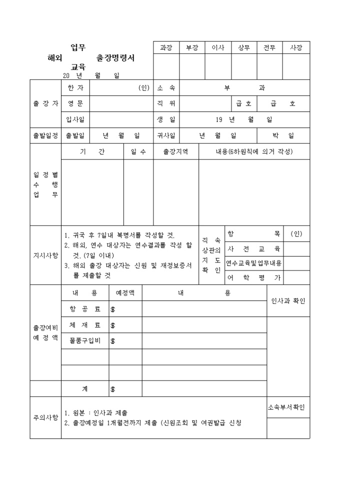 9,000원/월해외 업무 및 교육에 대한 출장명령으로 출장자, 출발일정, 일정별 수행업무, 지시사항, 출장여비 예정액, 주의사항 등으로 구성되어 있습니다.