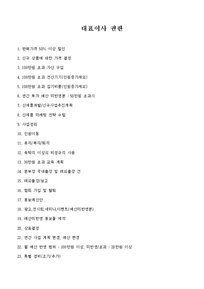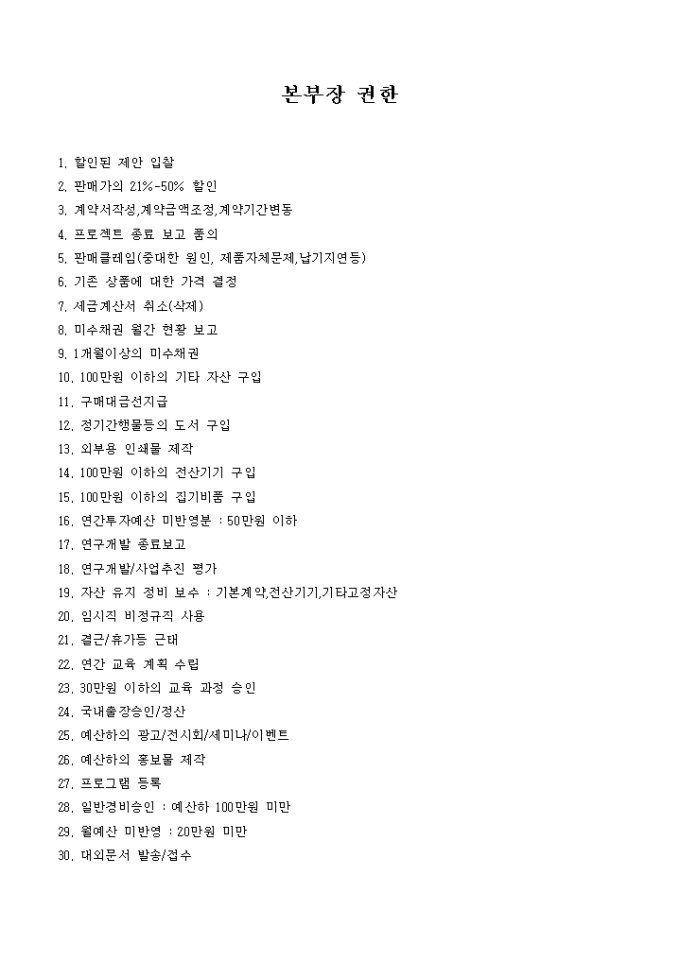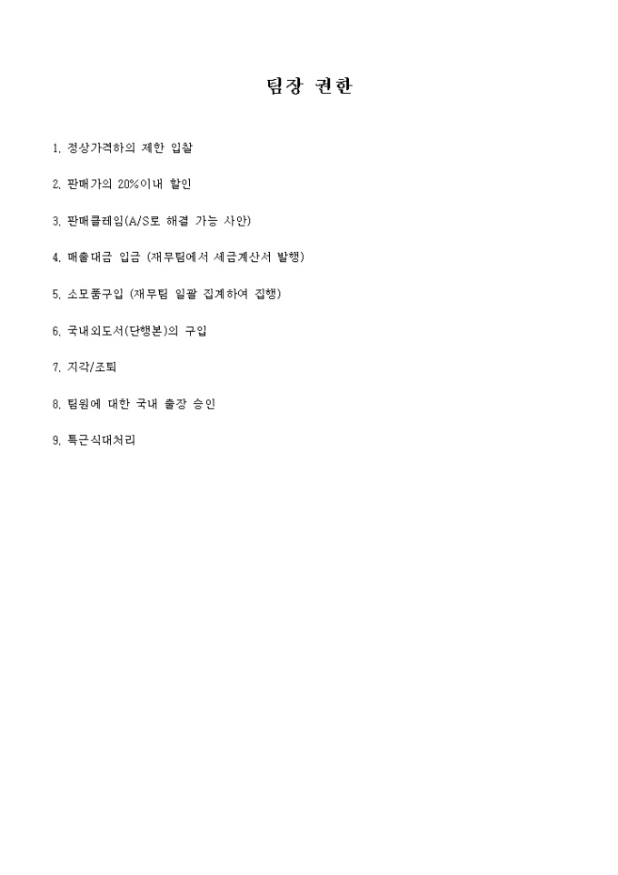9,000원/월대표이사, 본부장, 팀장의 직급별 권한을 정리해 놓은 양식입니다.