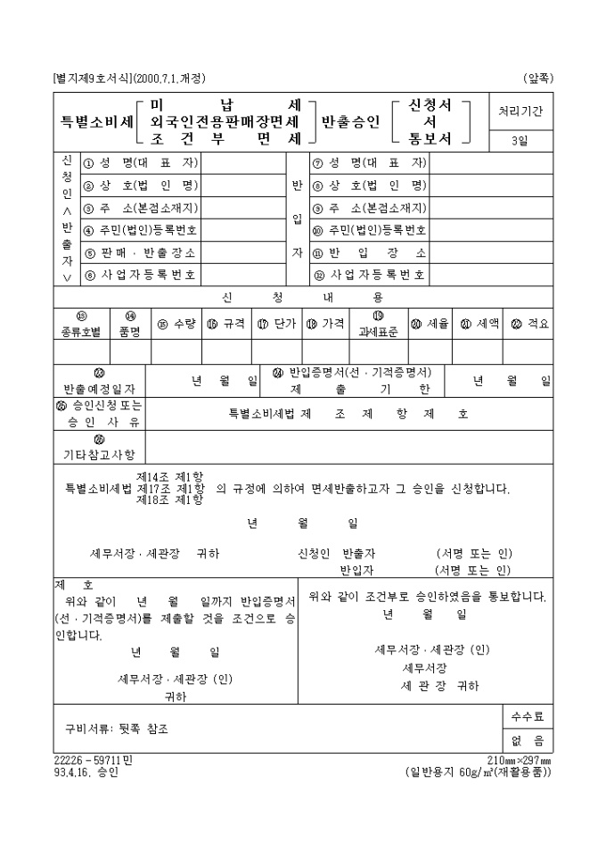 특별소비세법 제14조 제1항,제17조 제1항,제18조 제1항 의 규정에 의하여 면세반출하고자 그 승인을 신청합니다.
