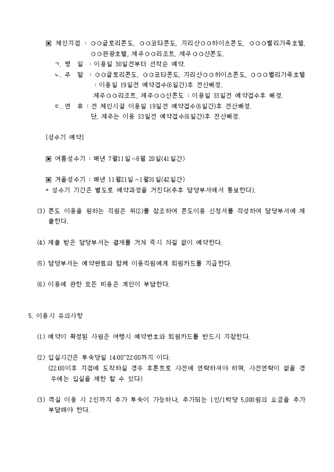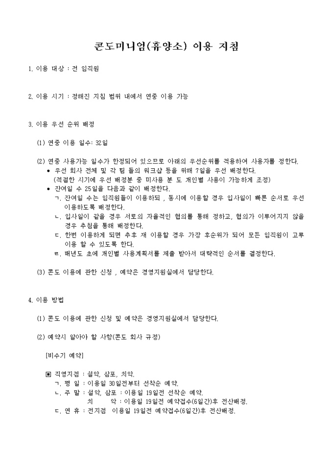 이용대상, 이용시기, 이용 우선순위 배정, 이용방법, 유의사항 등을 포함한 휴양소 이용 지침입니다.