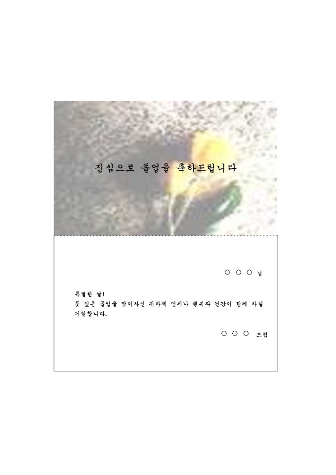 졸업식을 맞은 지인에게 간단한 축하메시지를 보낼때 사용할 수 있는 카드속지로서, 노란색 장미 배경이 인상적입니다.